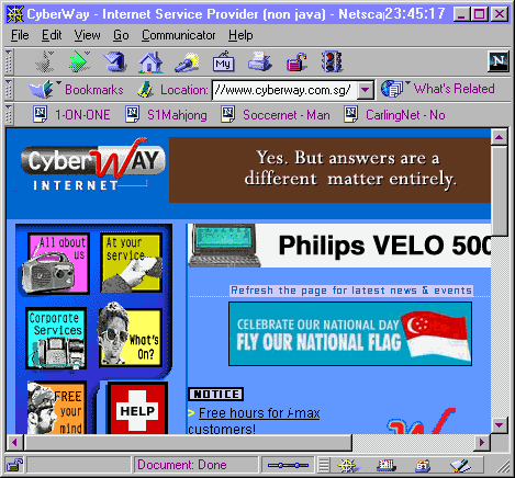 Screen Shot of Netscape Communicator 4.5 beta 1 Netscape Communicator 4.5 beta 1 is not really a new product. A revamp of it's user interface and an addition of some new features. In this review, we will talk about some of the good and bad about it. The Good To my surprise, NC4.5b1 loads much faster than it's predecessor NC 4.05 and IE 4.01. On my overclocked Celeron running at 400mhz, it took less than 3 seconds to launch. Gone away is the annoying initialising Java when it first loads up. Looks like NS4.5b1 is also non Java compliant. When I click on the About Communicator, the Java logo is missing. Thus it implies that certain Java applets might not run properly depending on which camp the applets are written for. The other thing that I took notice is the button "What's Related". I did a test on it but nothing seems to happen. From what I could gather, the reason is because I am behind a proxy server. According to some reports, this will be rectified in later betas of NC4.5 The Bad I did an experiment with both IE4.01 (Win98) and NS4.5b1 running side by side. I keyed in the URLs of a foreign site which I have surf before e.g. http://www.essex.ac.uk I gave NS4.5b1 a 3 seconds lead, and guess what, IE4 loads much faster than NS4.5b1 by at least 5-8 seconds on average. Another experiment I did was to load the page first, shut down both NS4.5 and IE4.01. Later I launch both and load the old pages http://www.essex.ac.uk. It looks like IE4.01 beats NS4.5b1 totally in terms of speed. Most of the sites I tried using the two experiments generated the same results.